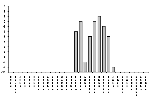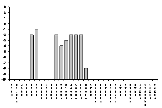 Les carrés noirs représentent graphiquement les points lumineux de l'écran de l'Inovonics qui situent en décibels [verticalement] les masses de fréquences [horizontalement] . Pour plus de commodité nous utiliserons dorénavant la transposition graphique suivante.